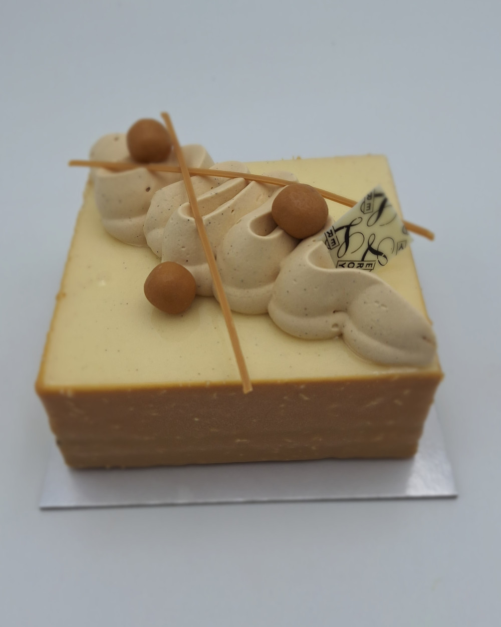 Croustillant praliné amande,biscuit chocolat,crémeux caramel et mousseux vanille